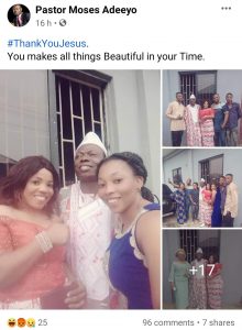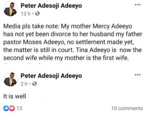Peter Adesoji Adeeyo, who is also a pastor, revealed in a Facebook post that his father did not divorce his mother before wedding a member’s wife so his mother is still legally the first wife. He wrote: “My mother Mercy Adeeyo has not yet been divorced to her husband my father pastor Moses Adeeyo, no settlement made yet, the matter is still in court. Tina Adeeyo is now the second wife while my mother is the first wife.”
