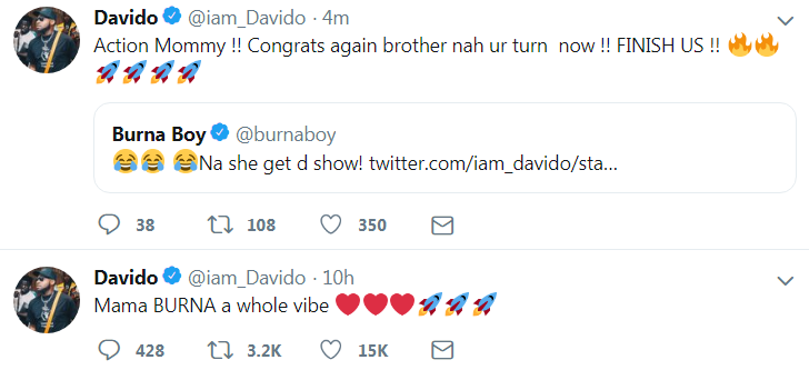 Davido has gone to his twitter page to congratulate Burna boy on his victory yesterday at the Soundcity Award events. Remember that Burnaboy bagged out Four awards from the event and his mum was the “Show stealer”, he wrote this