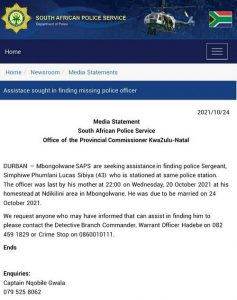 The police command in KwaZulu-Natal, South Africa has declared Sergeant Simphiwe Phumlani Lucas Sibiya, who is stationed at the same police station missing.