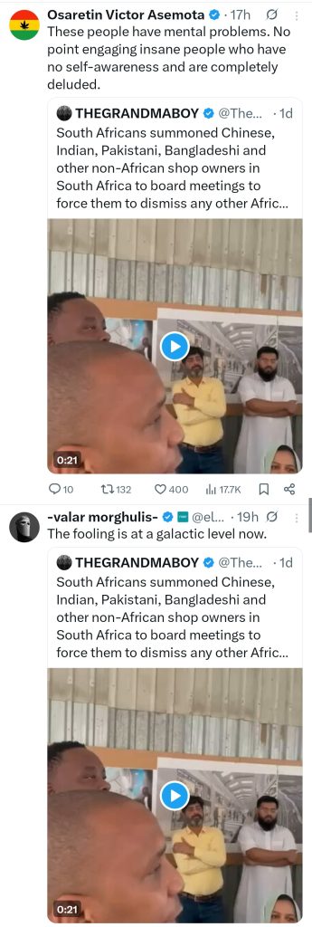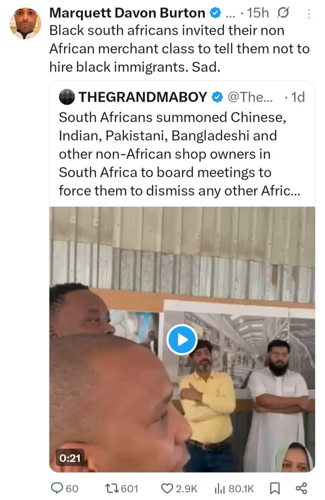 The video was shared with the caption: “South Africans summoned Chinese, Indian, Pakistani, Bangladeshi and other non-African shop owners in South Africa to board meetings to force them to dismiss any other African nationals they employed, because they do not want other Africans working for them.”