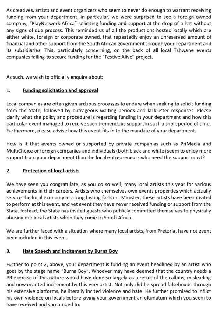 “Whoever may have deemed that the country needs a PR exercise of this nature would have done so largely as a result of the callous, misleading and unwarranted incitement by this very artist. Not only did he spread falsehoods through his extensive platform, he literally incited violence and hate,” the letter said of Burna Boy, suggesting that government had succumbed to pressure from him.