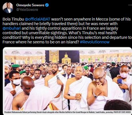 Tweeting, Sowore wrote: “Tinubu @officialABAT wasn’t seen anywhere in Mecca (some of his handlers claimed he briefly traveled there).