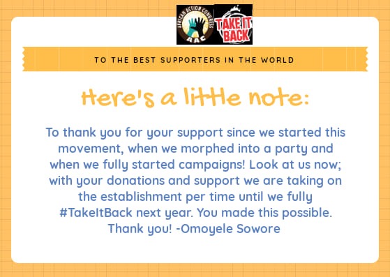 APPRECIATION: As we count down to ring in the New year in a few hours I deeply want to say THANK YOU! For buying into this vision to #TakeBack Nigeria, for carrying it to the highways and hedges, funding it, defending it and making it a reality to change Nigeria with innovation and ideas as has never been seen before even on the continent of Africa. On behalf of everyone at the SoworeRufai2019 Campaign Organisation, Thank you!
