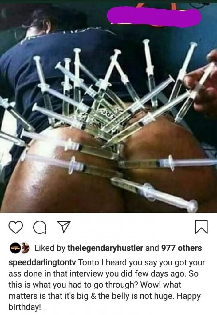Joining others to celebrate Tonto, Speed Darlington, who regularly professes love for the actress, shared a photo of a woman with multiple syringes sticking out of her butt and added a caption that’s unusual for a birthday message.