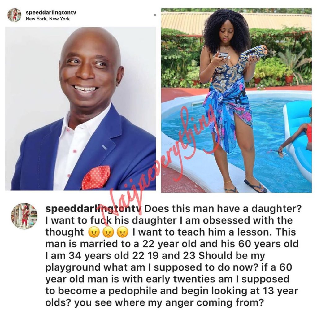 So, Speedarlington took to instagram to reveal his desire to sleep with the daughter of Regina Daniel’s husband, which is her step daughter