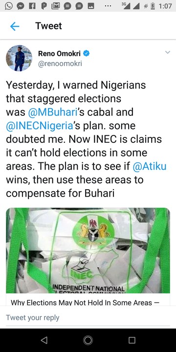 Yesterday Reno Omokri raised an alarm that INEC was secretly planning staggered elections and as usual those involved denied it until INEC late last night admitted that it might not be able to conduct elections in some places.