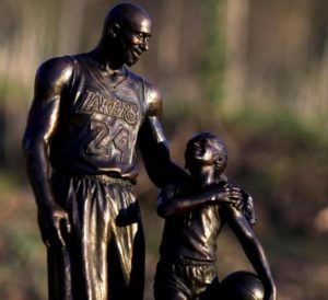 The bronze statue depicts Kobe and Gigi wearing basketball uniforms and sharing a loving glance as Gigi holds her father’s hand as it rests on her shoulder.