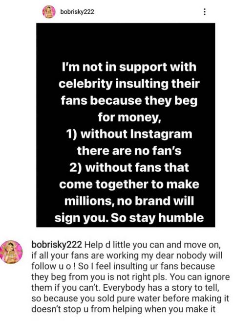 Reacting on Instagram, Bobrisky said raining insults on fans who beg for money is not ‘right’ because without Instagram, ‘there are no fans’ to support them.