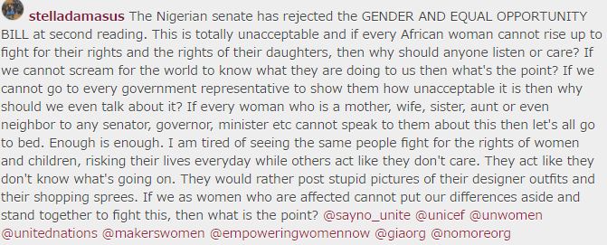 Stella Damasus took Instagram to show her displeasure after the Nigerian Senates rejected the gender equality bill at second reading.