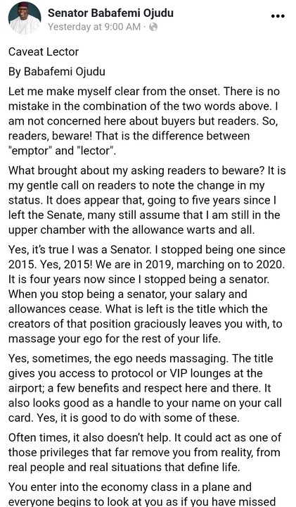 Yes, it’s true I was a Senator. I stopped being one since 2015. Yes, 2015! We are in 2019, marching on to 2020. It is four years now since I stopped being a senator. When you stop being a senator, your salary and allowances cease. What is left is the title which the creators of that position graciously leaves you with, to massage your ego for the rest of your life.