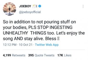 In his words; ‘‘So in addition to not pouring stuff on your bodies, PLS STOP INGESTING UNHEALTHY THINGS too. Let’s enjoy the song AND stay alive. Bless”