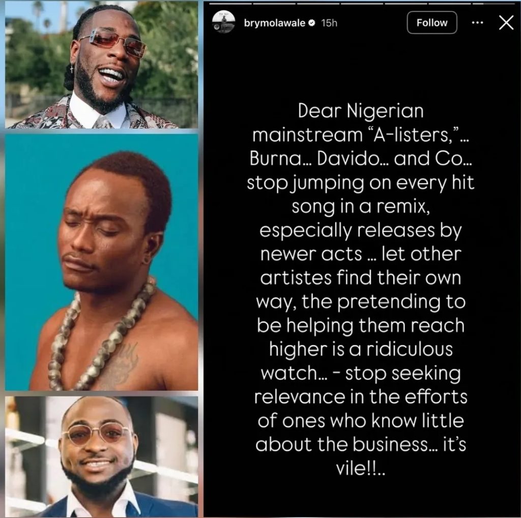 Singer Brymo has called out top Nigerian artistes like Burna Boy, Davido and others, accusing them of constantly jumping on remixes of trending songs, especially from upcoming acts.