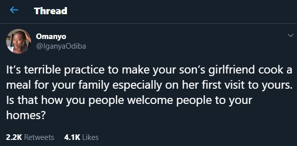 Iganya Odiba has taken to Twitter to call out parents who make their son’s girlfriend to cook for the family during her first visit.
