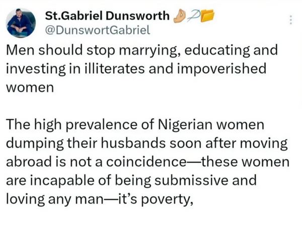 A Nigerian scholar identified as Dunswort Gabriel, has taken to Twitter to advise Nigerian men to stop getting married to illiterates and impoverished women and investing in them by sending them abroad because it won’t end well.