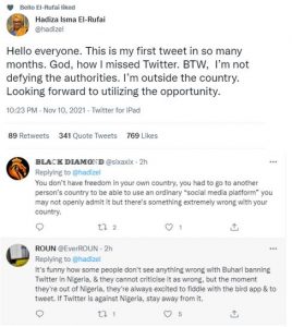 Nigerians have slammed Hadiza Isma El-Rufai, the first lady of Kaduna state for tweeting outside the country following the suspension of Twitter in the country.