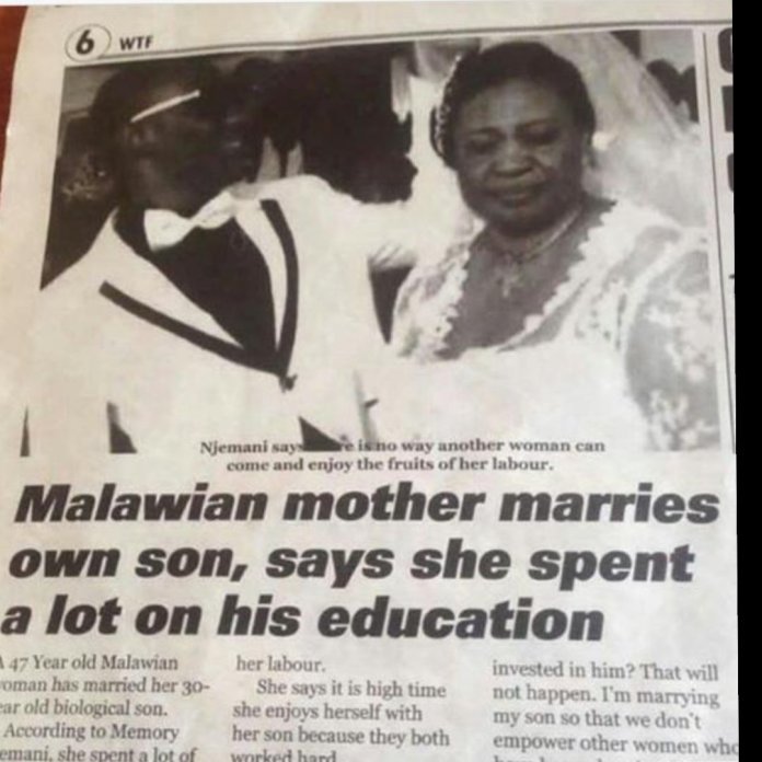 In a publication in one of the Malawian newspapers some years ago, the woman, Memory Njemani revealed that she married her son because she has invested a lot in his education.