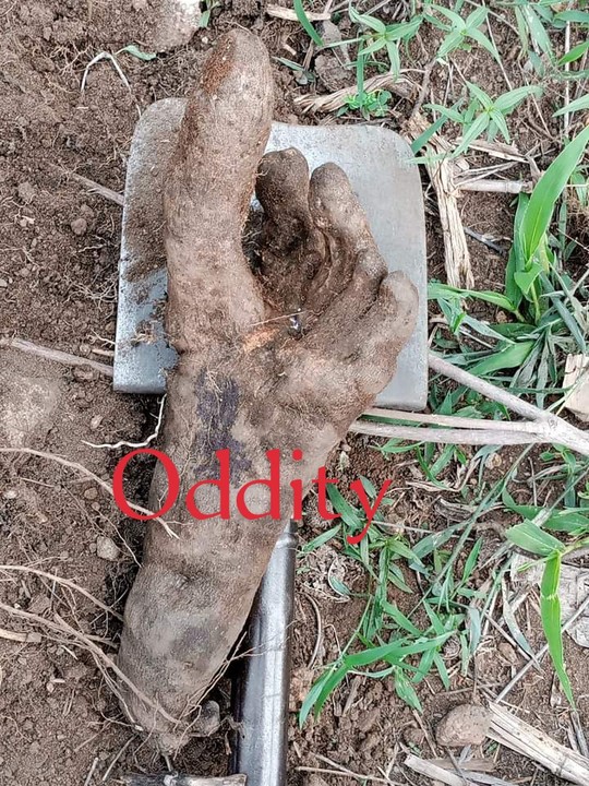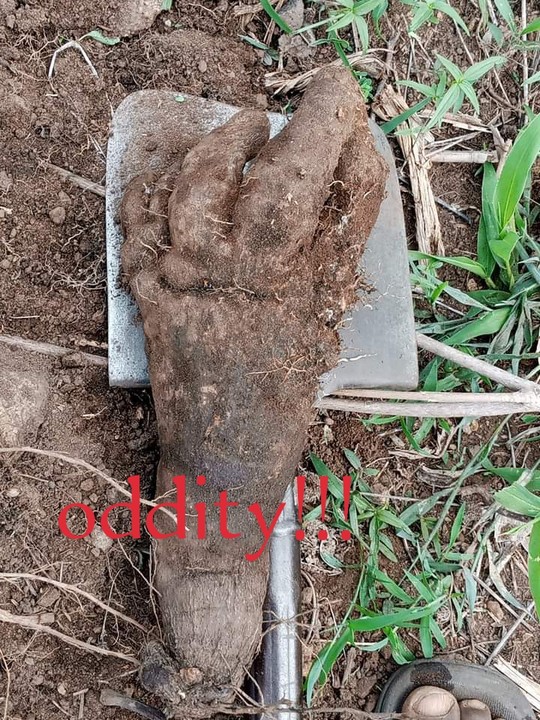 The odd looking yam which could be described as something from a horror movie looked more like the left hand of a giant of some sort, while some people were rebuking and forbidding the odd shape, some elders in the village stated that it could be linked to the practice of some settler farmers who allegedly use water from the mortuary used in bathing dead bodies to water their plants for bigger yeild, what do you think.