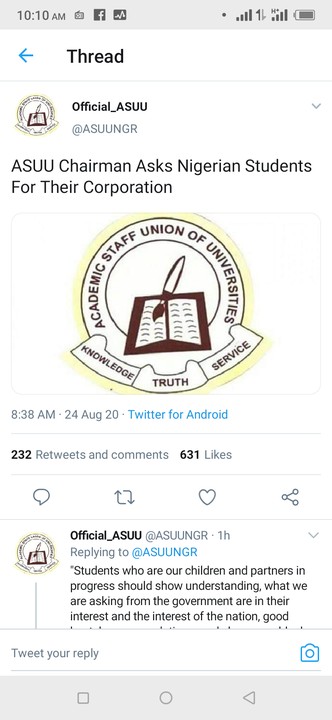 “Students who are our children and partners in progress should show understanding, what we are asking from the government are in their interest and the interest of the nation, good hostel accommodation, good classroom blocks that can engender effective learning,……..