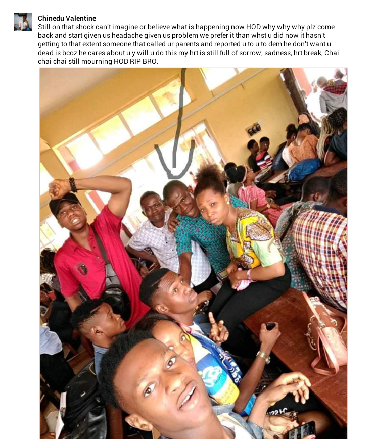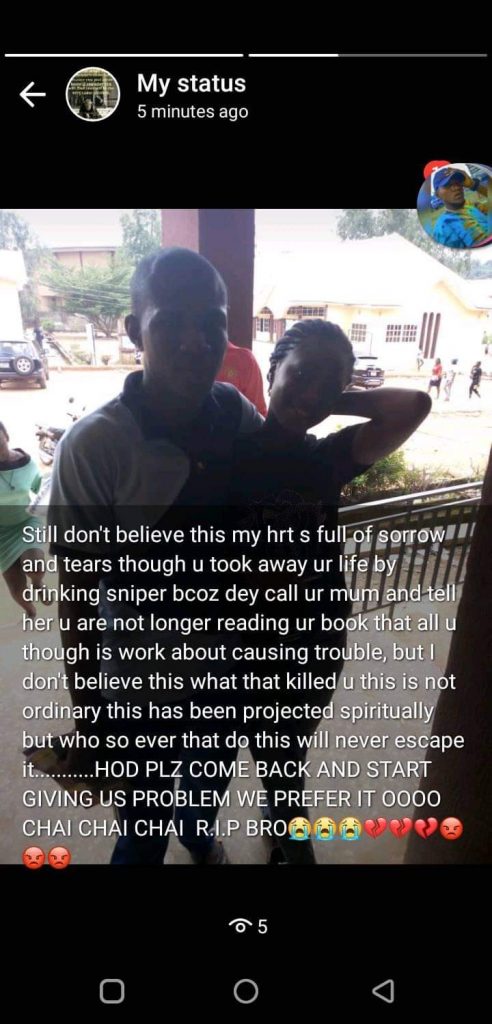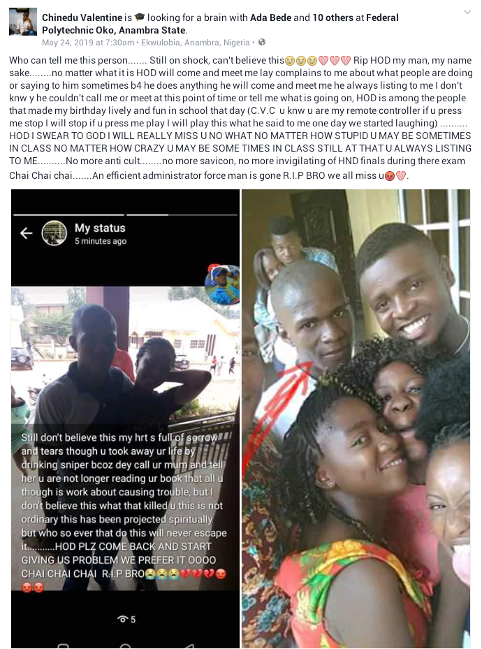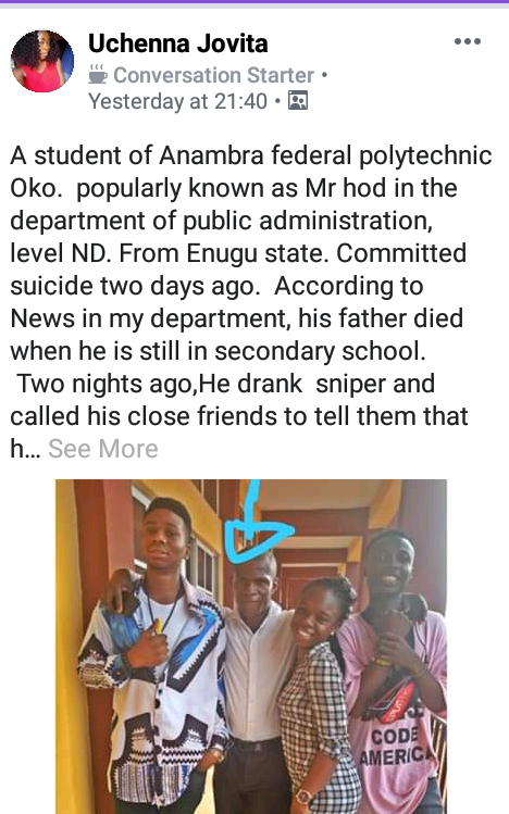 “A student of Anambra federal polytechnic Oko.  popularly known as Mr hod in the  department of public administration, level ND. From Enugu state. Committed suicide two days ago.  According to News in my department, his father died when he is still in secondary school.