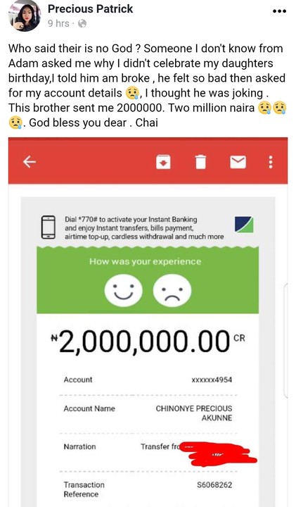 “Who said here is no God? Someone I don’t know from Adam asked me why I didn’t celebrate my daughter’s birthday, I told him am broke, he felt so bad then asked me for my account detaild , I thought he was joking. This brother sent me 2000000 two million naora. God bless you dear, chai”