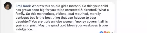 Where’s this stupid girl’s mother? So this your child has grown sooo big for you to be corrected & directed? What a family. So this mannerless, violent, loud mouthed, morally bankrupt boy is the best thing that can happen to your daughter? You are truly an igbo woman; ‘money covers it all’ is your sign post. May the good Lord bless your weakness & over indulgence.