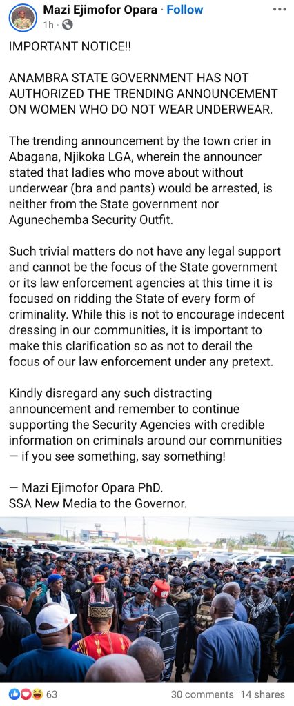 He released a statement on Monday, Feb. 17, that reads: “The trending announcement by the town crier in Abagana, Njikoka LGA, wherein the announcer stated that ladies who move about without underwear (bra and pants) would be arrested, is neither from the State government nor Agunechemba Security Outfit.