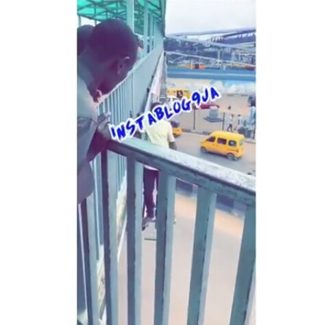Here is the moment a suicidal man tried jumping down from a pedestrian bridge, before being stopped, yesterday, in Berger, Lagos.