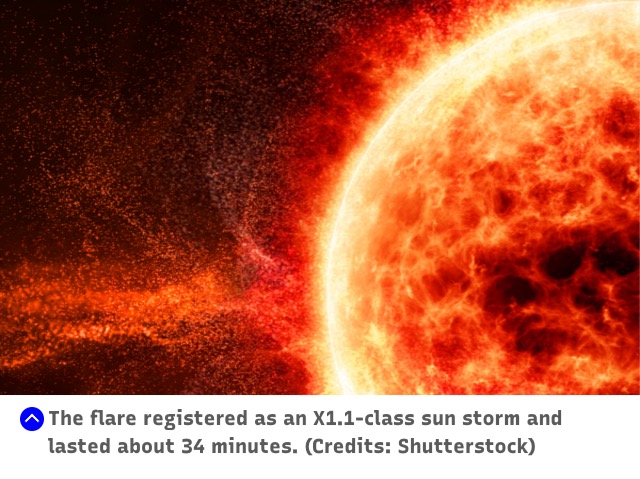 The flare registered as an X1.1-class sun storm and lasted about 34 minutes, SWPC officials said.