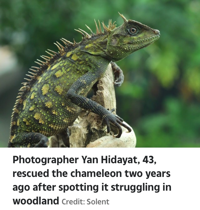Photographer Yan Hidayat, 43, rescued the chameleon two years ago after spotting it struggling in woodland.