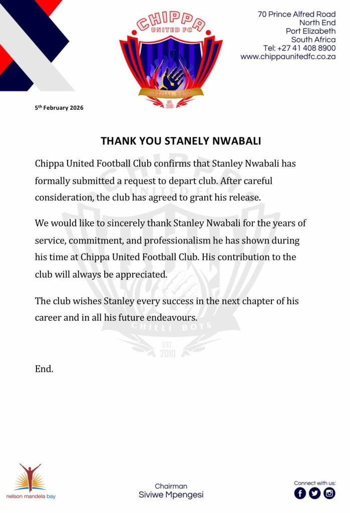 The statement read, “We would like to sincerely thank Stanley Nwabali for the years of service, commitment, and professionalism he has shown during his time at Chippa United Football Club, his contribution to the club will always be appreciated, and we wish him success in the next chapter of his career.”
