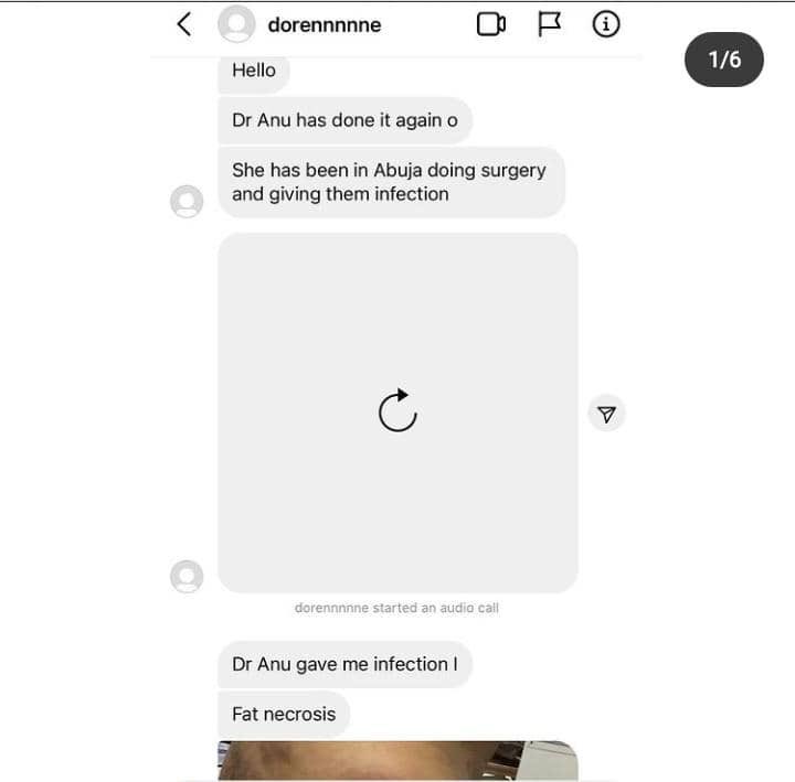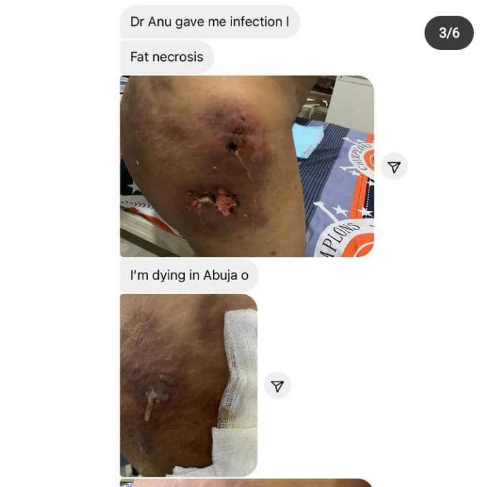 The patient wrote, “Dr Anu gave me an infection, fat necrosis, I’m dying in Abuja.”
