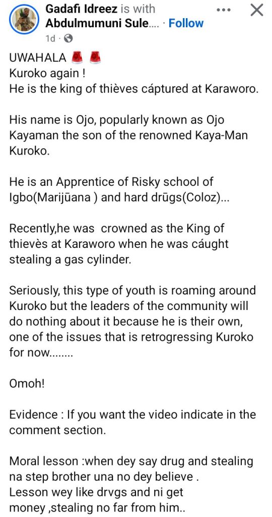 “He is an Apprentice of Risky school of Igbo (Marijūana ) and hard drugs. Recently, he was  crowned as the King of Thieves at Karaworo when he was caught stealing a gas cylinder.