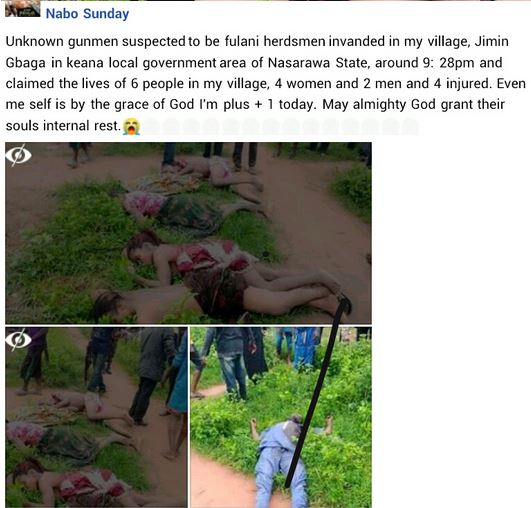“At about 9:45pm yesterday, unknown gunmen suspected to be Fulani herdsmen attacked Tse-Jimin village, Jimin Gbaka is in Aloshi kingdom of Keana LG, six persons were killed , two males and four females,” he said.