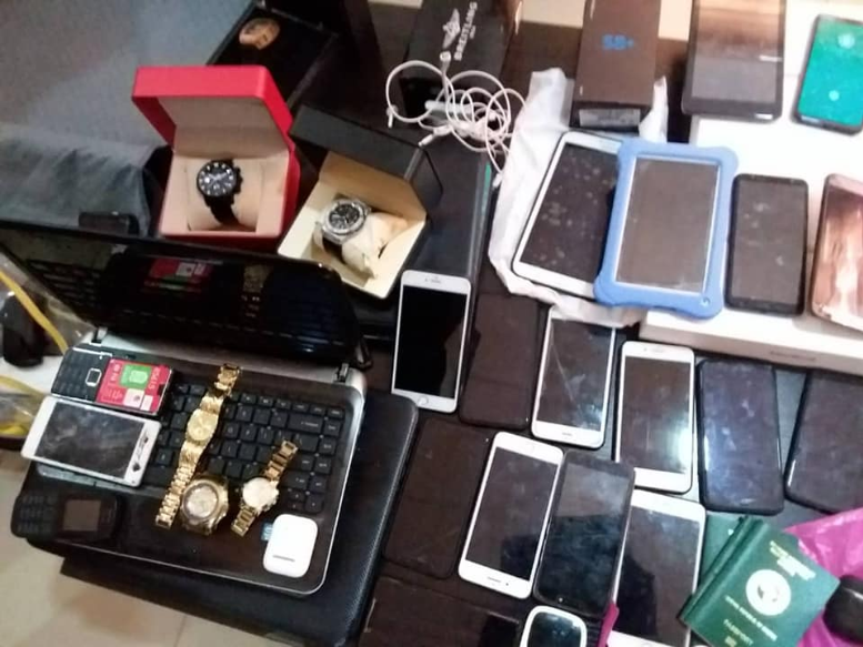 Other items recovered at the point of arrest include, a Toyota Venza car, 18 exotic phones (iPhones, Samsung, etc), three Apple iPads, five laptops, two international passports, several SIM cards of various networks, two Mifi and several flash drives, 11 ATM cards, exotic wrist watches and an exotic variant of indian hemp (Haze). They attempted hiding some of the items in the microwave, toilet water closet and bathroom sink.