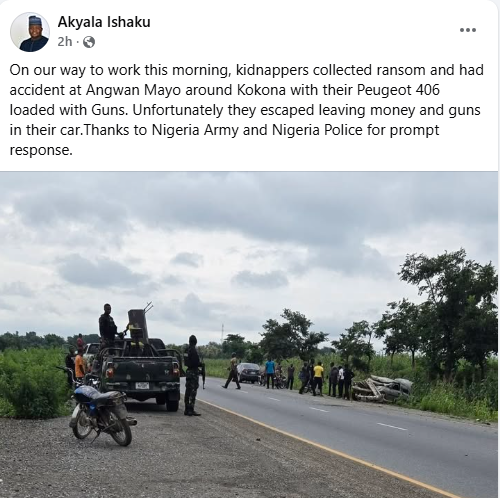 “On our way to work this morning, kidnappers collected ransom and had accident at Angwan Mayo around Kokona with their Peugeot 406 loaded with Guns. Unfortunately they escaped leaving money and guns in their car. Thanks to Nigeria Army and Nigeria Police for prompt response,” he wrote.