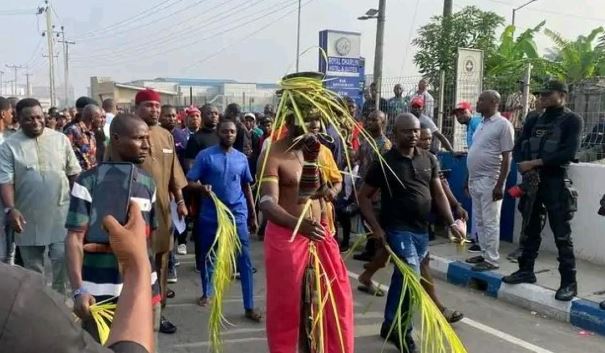 A report by The PUNCH also noted that protesters placed several fetish materials in the middle of the road with a man dressed like a ‘juju priest’, presiding over affairs, pouring libations, and making incantations in a local dialect.