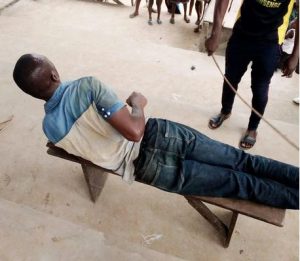 A suspected plantain thief identified as Martins Dickson met his waterloo as he was mercilessly flogged with a cane and fined in Bayelsa State.