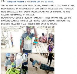 The suspect specialises in stealing people’s plantain on Sundays when they are in church before he was caught and dealt with.