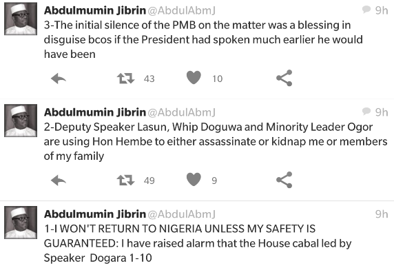 Suspended lawmaker Abdulmumin Jibrin who left for London last week, says he is not coming back to Nigeria unless his safety is guaranteed. According to him, Dogara and other principal officers of the House of Reps are planning to assassinate or kidnap him and members of his family. See more of his tweets after the cut…