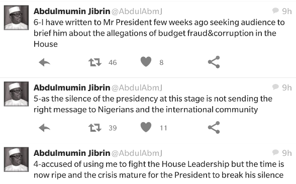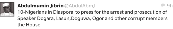 Suspended lawmaker Abdulmumin Jibrin who left for London last week, says he is not coming back to Nigeria unless his safety is guaranteed. According to him, Dogara and other principal officers of the House of Reps are planning to assassinate or kidnap him and members of his family. See more of his tweets after the cut…