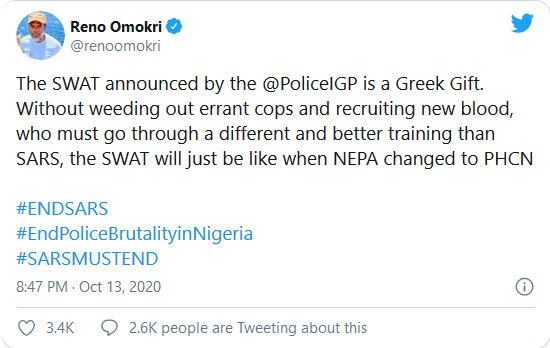 “The SWAT announced by the @PoliceIGP is a Greek Gift. Without weeding out errant cops and recruiting new blood, who must go through a different and better training than SARS, the SWAT will just be like when NEPA changed to PHCN #ENDSARS #EndPoliceBrutalityinNigeria#SARSMUSTEND.”