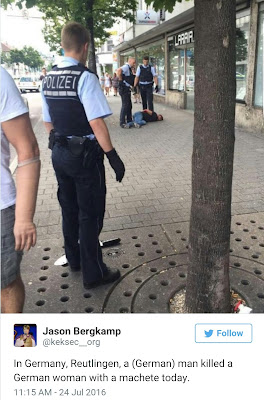 At least one person is dead and two others are injured after a 21 year old machete-wielding Syrian refugee allegedly attacked passersby on a German street today. The man randomly attacked people near a kebab shop in the city of RReutlinge.