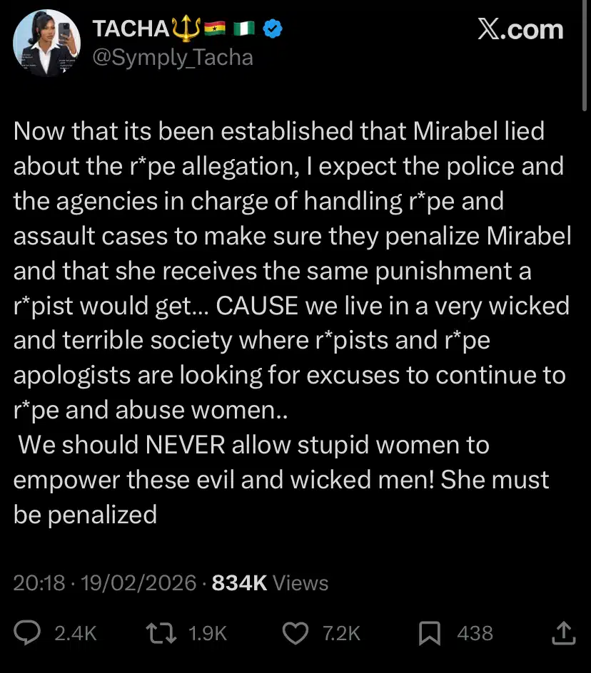 Tacha wrote: “Now that it’s been established that Mirabel lied about the rpe allegation, I expect the police and the agencies in charge of handling rpe and assault cases to make sure they penalize Mirabel and that she receives the same punishment a rpist would get… CAUSE we live in a very wicked and terrible society where rpists and rpe apologists are looking for excuses to continue to rpe and abuse women.. We should NEVER allow stupid women to empower these evil and wicked men! She must be penalized.”