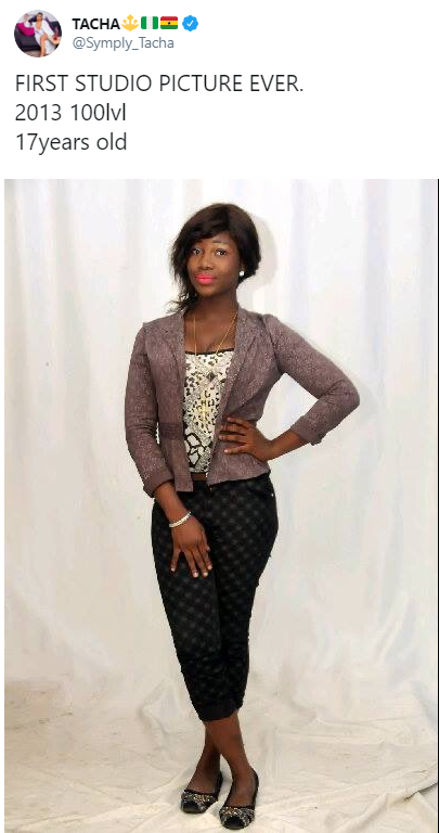 Big Brother Naija disqualified housemate, Tacha took to Twitter to share her first ever studio picture which she took at the age of 17.