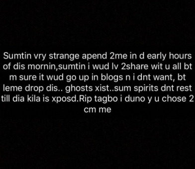 “Rip tagbo i dunno y u chose to come to me ?,Wen u kill sumone n u follow d pesin to d spiritual realm to shut him up totally… i dnt no tagbo i v neva seen or spoken to him or know sumone dat knows him.. i av given ur msg to d pesin u wanted me to giv it to but m sorry i cnt share on my page for security reasons..it was hell gettin ha number but u made it available to me…u r such a sweet n gentle spirit.. pls rest in peace n let God fight for u..?bye’