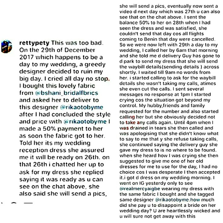 A lady who goes by the name Rettypety on Instagram has called out her tailor for allegedly giving the clothes she asked her to design for her recent wedding to actress, Mercy Aigbe. Mercy Aigbe has been shining since morning with the dress all over social media as she took an expensive photoshoot with the dazzling red dress.