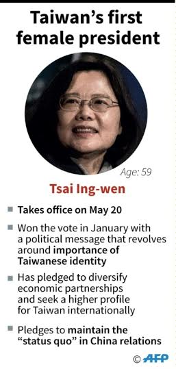 The 59-year-old former law professor who studied in The U.S takes over from outgoing Kuomintang (KMT, or Nationalist Party) President Ma Ying-jeou, who was ineligible for re-election after two four-year terms.