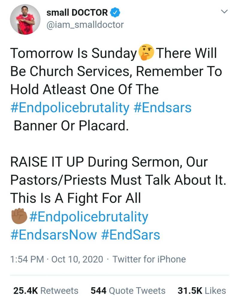 Here is a tweet from singer Small Doctor calling for EndSARS placards inside churches.