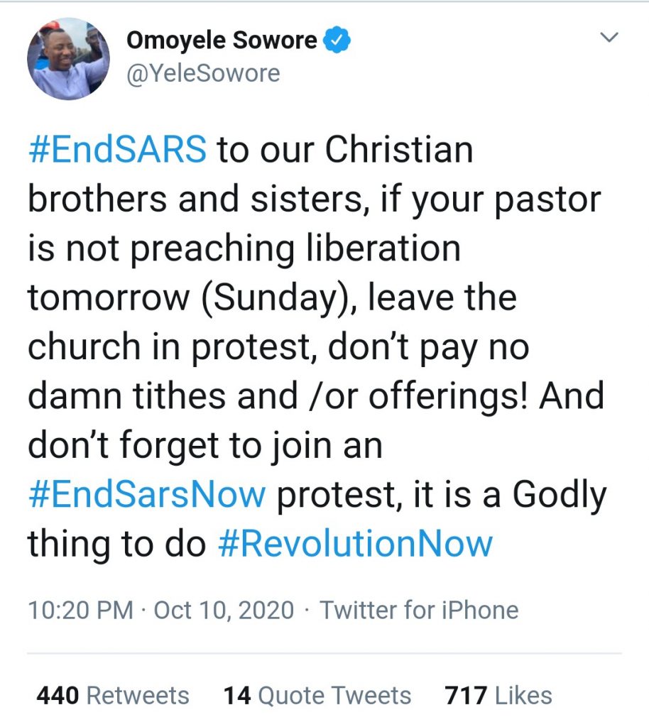 #EndSARS to our Christian brothers and sisters, if your pastor is not preaching liberation tomorrow (Sunday), leave the church in protest, don’t pay no damn tithes and /or offerings! And don’t forget to join an #EndSarsNow protest, it is a Godly thing to do #RevolutionNow