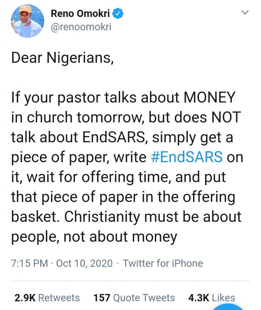 Former presidential aide, Reno Omokri is also part of the plot to disrupt the House of God. On his own part, he tweeted that if pastors don’t talk about EndSARS in church this Sunday, people should desecrate the offering meant for God. While Christians will be placing their money into the offering box, Reno Omokri is saying that EndSARS protesters should write EndSARS on a piece of paper and place it inside the box as their offering instead of money.
